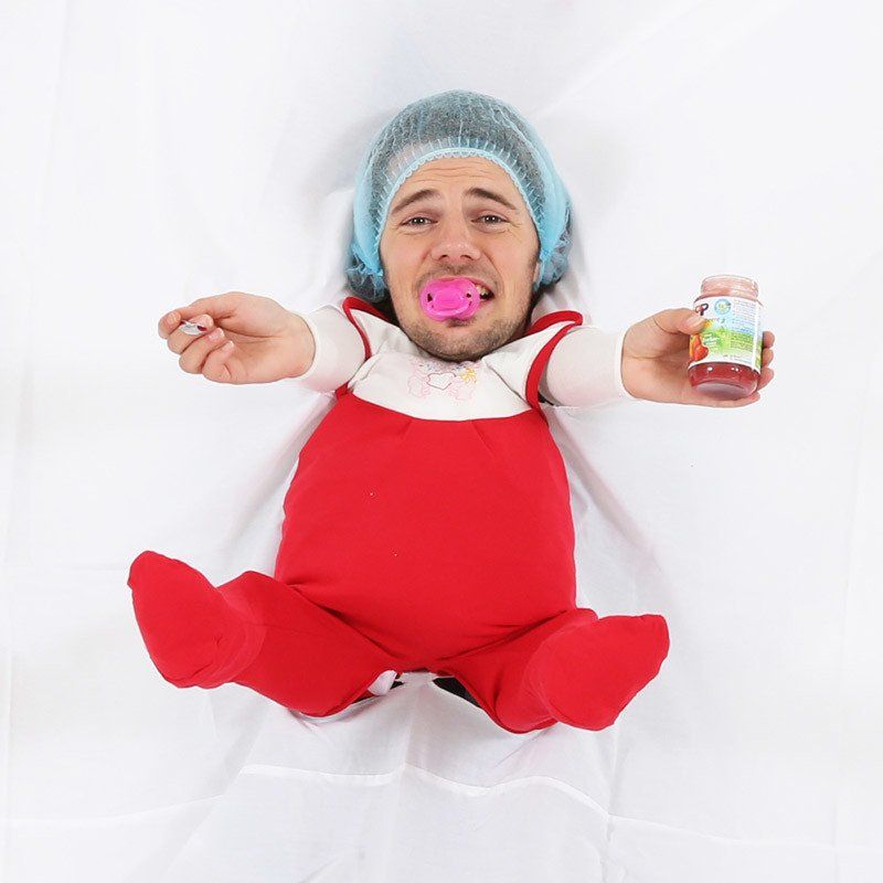 Bei diesem Spiel wird der Bräutigam noch einmal in seine Babyjahre zurückversetzt. Zwei Helfer halten ein Bettlaken vor den Bräutigam. Auf dem Laken ist ein Babystrampler angenäht. Über dem Strampler befindet sich eine Öffnung, durch die der Bräutigam seinen Kopf steckt.