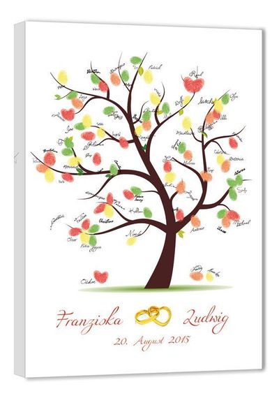 Bei diesem Spiel müssen Eure Gäste ihre Fingerabdrücke abgeben. Stellt eine Leinwand mit einem Baummotiv auf. Ihr könnt neben den Baum auch noch Eure Namen und das Hochzeitsdatum drucken lassen.